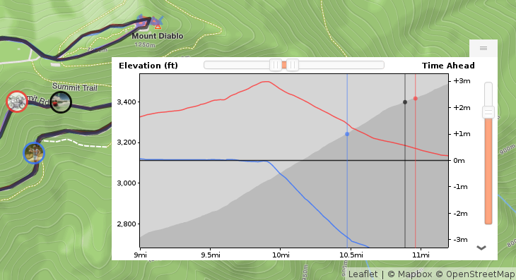 Near mile 10, black accelerates and drops blue. Black is now moving the fastest. At the time shown as red nears mile 11, black is only about 30 seconds behind. View this example.